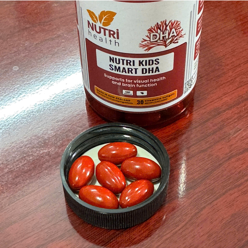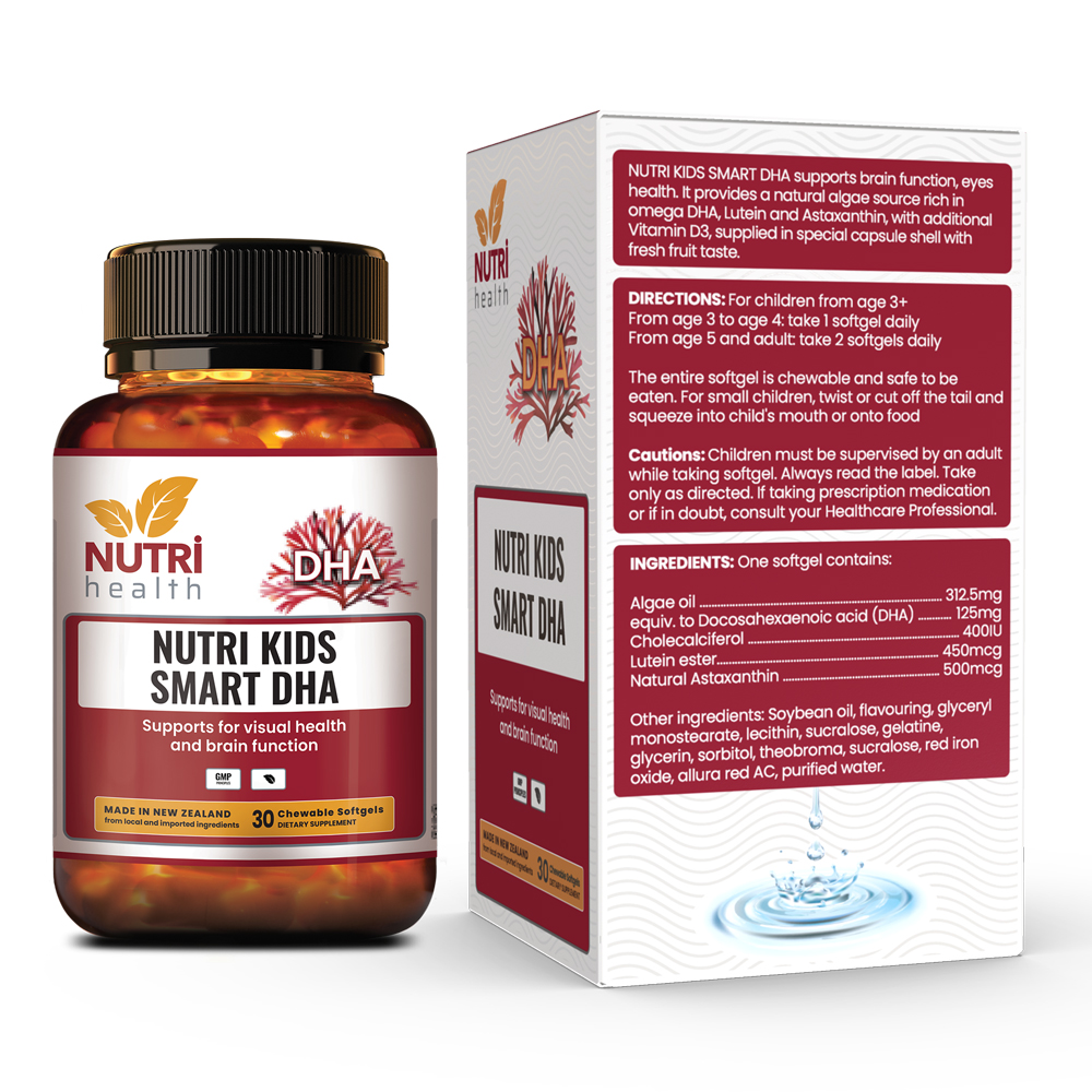 Nutri Kids Smart DHA cung cấp nguồn omega DHA tinh khiết từ tảo biển New Zealand, giúp tăng cường sức khỏe não bộ, hỗ trợ phát triển thị giác. Nutri DHA cung cấp 125mg DHA trong một viên, giúp bổ sung dưỡng chất cho trí não trẻ. Tảo biển có khả năng tạo ra DHA một cách tự nhiên. Với công nghệ bào chế đặc biệt, Nutri Health chiết xuất lipit từ loại vi tảo biển này, sau đó tinh chế để tạo ra một loại dầu rất giàu omega 3 DHA. Với nguồn omega 3 DHA phong phú, Tảo biển là nguồn cung cấp DHA hoàn toàn từ thực vật. Theo Cơ quan An toàn Thực phẩm châu Âu (EFSA), DHA đóng vai trò quan trọng trong hoạt động của não bộ và góp phần vào sự phát triển bình thường của não bộ ở trẻ sơ sinh, trẻ nhỏ và người lớn. Liều dùng khuyến nghị cung cấp lượng DHA hàng ngày là 100mg cho trẻ dưới 24 tháng tuổi và 250mg cho trẻ từ 2-18 tuổi.