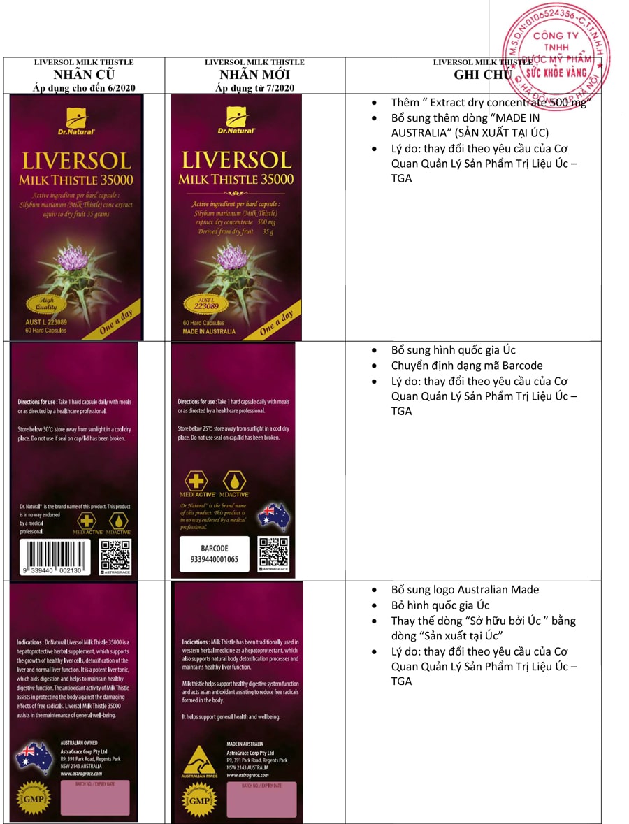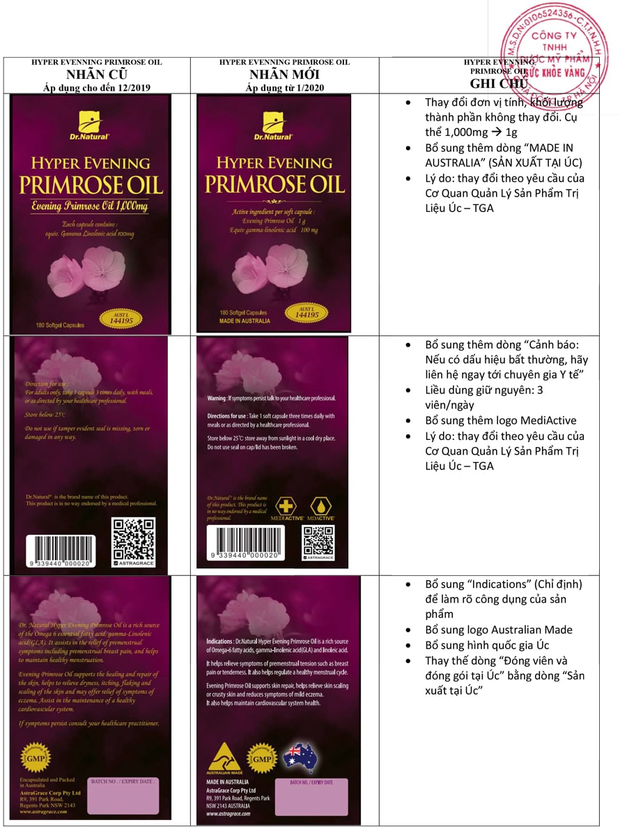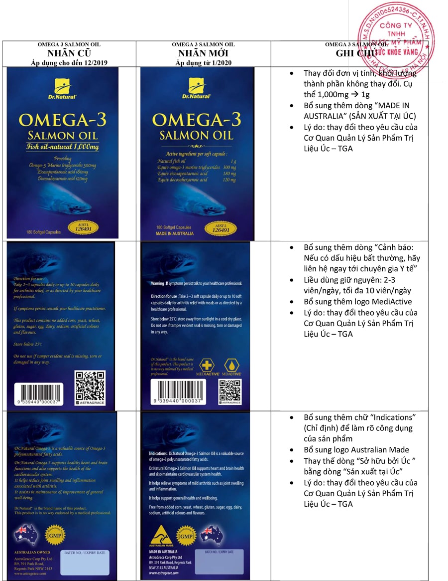 Thay đổi Nhãn sản phẩm từ Astragrace. Kể từ tháng 1/2020, dòng Dr. Natural của hãng Astragrace (Australia) thay đổi nhãn mác theo yêu của cơ quan quản lý Australia