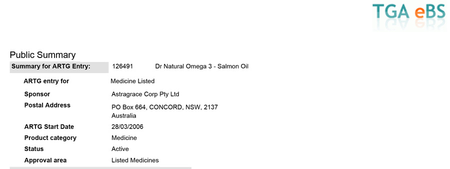 Bấm vào ảnh dưới đây sẽ đưa bạn tới thông tin gốc cấp phép cho sản phẩm Omega 3 Salmon Oil bởi Cơ quan Quản Lý Thuốc Và Trị Liệu TGA - Australia